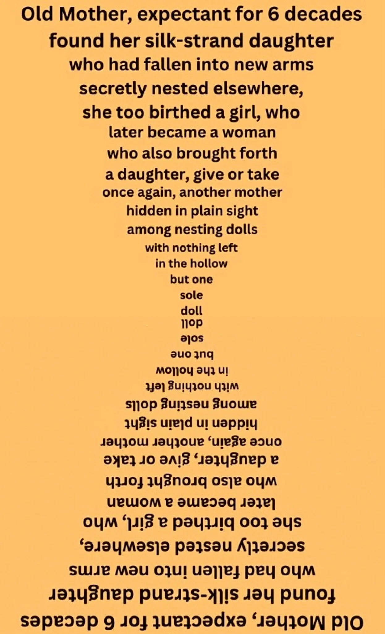 Eight weeks ahead of schedule, eager to leave, I pull you into myself. My face presses against your back, hard. I am thunderbolt ready. YOU have long been ready.